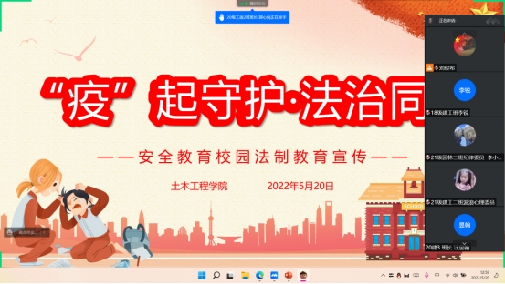 当前,疫情防控形势仍然严峻复杂,为进一步筑牢疫情防控坚实的思想防线,2022年5月20日,www.国产精品朋辈工作团在云端开展法制宣传,得到了土木学子的热烈响应。