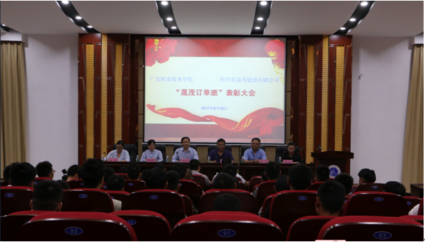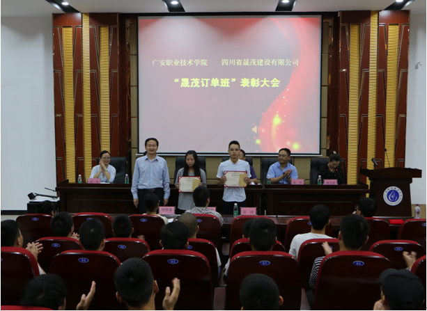 2017年9月19日下午16:30,广安职业技术学院www.国产精品在明德楼希贤厅召开召开“晟茂订单班”优秀学生表彰大会。四川省晟茂建设有限公司人力行政总监李权生、四川省晟茂建设有限公司招聘培训主管缪皓洁、学校对外交流与合作处处长蒋华、www.国产精品全体教师、15级晟茂订单班全体学生参加了此次大会。会议由www.国产精品办公室主任蒋艺溱主持。